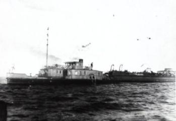 Черно-белая фотография иллюстрирует эвакуацию жителей г. Астрахани на баржах Волготанкера осенью 1941 года.
