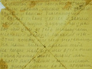 В первых строках нашего письма желаем тебе доброго здравия и великого благополучия в делах твоих, успеха и заочно крепко целуем, дорогой Шура. Вот мы уже от тебя не получаем несколько месяцев никаких известий, почему ты нам не отвечаешь на наши письма. Просим тебя, напиши нам, а то мы о тебе очень беспокоимся, мать плачет.