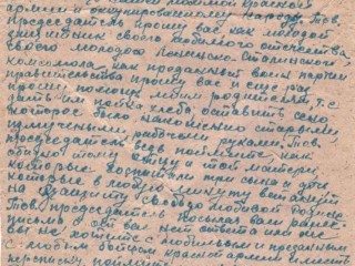 Дорогой тов. председатель передаю вам комсомольско - красноармейский привет и желаю вам наилучших успехов в Вашей жизни и работе. Дорогой воспитатель массы людей, людей нашей страны и направляющей к общественной работе на помощь нашей любимой Красной армии и оккупированному народу. Тов. председатель прошу вас, как молодой защитник своего любимого отечества, своего молодого Ленинско-Сталинского комсомола, как преданный воин партии правительства прошу вас и еще раз прошу помощь моим родителям, т.е. дать им хлеба, оставить сено, которое было накошено старыми, измученными, рабочими руками. Тов. председатель ведь поймите, как обидно тому отцу и той матери, которые воспитали три сына и дочь, которые в любую минуту встанут на защиту свободолюбивой Родине. Тов. председатель, посылая вам ранее письма, а от вас нет ответа или же вы не хотите с любимым и преданным с любым бойцом Красной армии иметь переписку, поймите имея переписку с бойцом Красной армии, тем более будешь иметь авторитет среди своих рабочих. Тов. председатель мне очень хочется знать ваше фамилии, имя и отчество. Прошу вас мою просьбу удовлетворить и дать ответ, как товарищу. До свидания. Остаюсь ваш земляк воин Курепина.