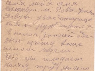 Я уже 2 года нахожус на фронт. Моя семя мой я семя Нахменберг.М. Вова. Фима. Живут у вас с.Старица балели нуждаются в помоч зимней одежы . прошу ваше помош надели. Ибо они голодает. Колхоз труд ничего не помогает. Забыли что я был член [РАХ]. Прошу выеснить Нахменберг А. 22/10 43