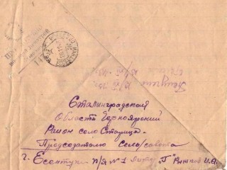 Май адрис: Стовр. Край г. Ессентуки п/я №1 Литер «Г» Рыжкову Иван Андреевичу, прошу атвете 25/XΙ 43 г. подпись