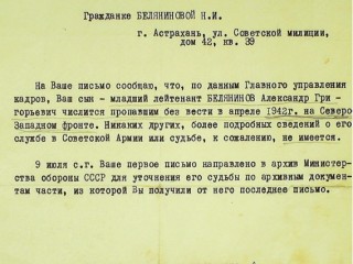На Ваше письмо сообщаю, что, по данным Главного управления кадров, Ваш сын - младший лейтенант БЕЛЯНИНОВ Александр Григорьевич числится пропавшим без вести в апреле 1942г. на Севере-Западном фронте. Никаких других, более подробных сведении о его службе в Советской Армии или судьбе, к сожалению, не имеется.