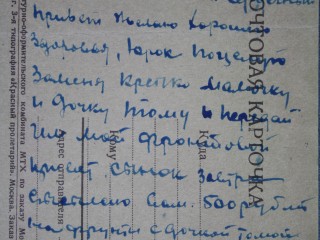Здравствуй, дорогой сынок. Передаю тебе свой сердечный привет. Желаю хорошего здоровья. Юрок, поцелуй за меня крепко мамочку и дочку Тому и передай им мой фронтовой привет. Сынок, завтра высылаю вам 500 рублей на фрукты с дочкой Томой. Сынок, сейчас у нас идут сильные бои.