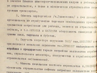 5. Обязать Окрторготдел (тов. Голованова) в 2-дневный срок организовать на стройучастке торговлю необходимыми продуктами, предметами потребления для рабочих, занятых на строительстве нефтеям, а т.т. Завзин[а] и Малышева оборудовать помещения для приема пищи, торговли и буфетов.