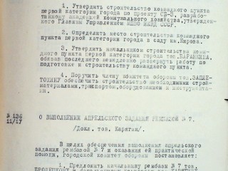 3. Утвердить начальником строительства командного пункта первой категории города тов. Баранкина, обязав последнего немедленно развернуть работу по подготовке и строительству командного пункта.