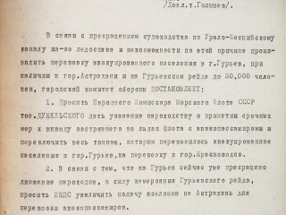 2. В связи с тем, что на гор. Гурьев сейчас уже прекращено движение пароходов, в силу замерзания Гурьевского рейда, просить НКПС увеличить подачу эшелонов на гор. Астрахань для перевозки эвакопассажиров.