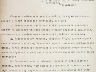 2. Астраханскому горкому, райкомам ВКП(б) и всем советским и комсомольским организациям округа оказывать максимальную помощь полку народного ополчения в сколачивании подразделений, военном обучении и постановке политическо-массовой работы среди ополченцев.