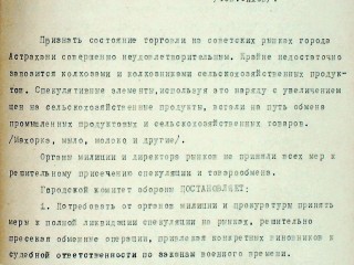 Признать состояние торговли на советских рынках гор. Астрахани совершенно неудовлетворительным. Крайне недостаточно завозится колхозами и колхозниками сельскохозяйственных продуктов. Спекулятивные элементы, используя это наряду с увеличением цен на сельскохозяйственные продукты, встали на пути обмена промышленных продуктовых и сельскохозяйственных товаров (махорка, мыло, молоко и другие). Органы милиции и директора рынков не приняли всех мер к решительному пресечению спекуляции и товарообмена.