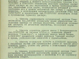 1. Обязать начальников пароходств «Рейдтанкер» тов. Черепанова, «Волготанкер» тов. Ромащенко и управляющего астраханской конторы Главнефтесбыта тов. Завзина обеспечить к 20.12.1941 г. вывоз на пристань Бузан всех поступивших на рейд высокооктановых авиабензинов.