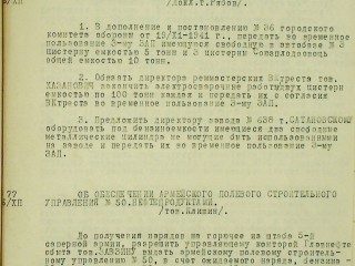 1. Предложить начальнику бронетанковой ремонтной базы № 7 тов. Сосенкову ускорить полностью освоение отведенных зданий под производственные корпуса и установить прибывшее оборудование. Оборудование цехов на бывшей картонной фабрике закончить к 10.01.1942 г., одновременно усиливая работу по ремонту танков.