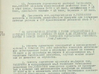 12. Разрешить управляющему конторой Главнефтесбыт при СНК СССР тов. Завзину выделить бронетанковой ремонтной базе № 7 в счет фонда бензина Б-70 – 20 тонн, автобензина – 30 тонн, дизельного топлива – 15 тонн, керосина – 10 тонн.