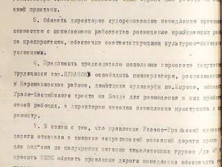 6. Предложить председателю горисполкома тов. Пузанову освободить пионерлагеря, расположенные в Наримановском районе, дом отдыха судоверфи им. Кирова, общежитие Урало-Каспийского треста на р. Болда для размещения в них прибывающих семей рабочих, а директорам заводов немедленно приступить к их ремонту.