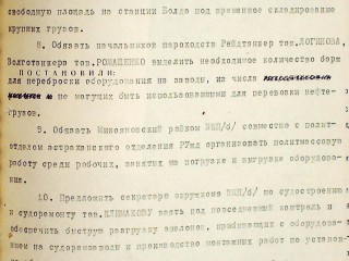 9. Обязать Микояновский РК ВКП(б) совместно с политотделом Астраханского отделения РУЖД организовать политмассовую работу среди рабочих, занятых на погрузке и выгрузке оборудования.