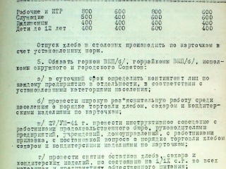 4. Обязать торгующие организации руководствоваться следующими нормами при отпуске по карточкам хлеба, сахара и кондитерских изделий, в граммах на человека: