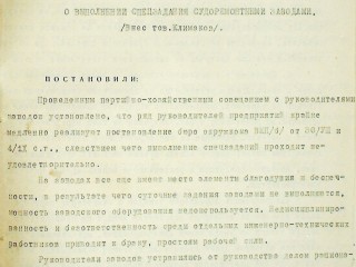 Проведенным партийно-хозяйственным совещанием с руководителями заводов установлено, что ряд руководителей предприятий крайне медленно реализуют постановление бюро окружкома ВКП(б) от 30.08 и 04.09 с.г., следствием чего выполнение спецзаданий проходит неудовлетворительно.