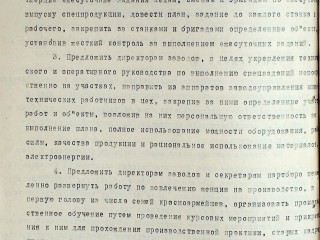 3. Предложить директорам заводов в целях укрепления технического и оперативного руководства по выполнению спецзаданий непосредственно на участках направить из аппаратов заводоуправления инженерно-технических работников в цех, закрепив за ними определенные участки работ и объекты, возложив на них персональную ответственность за выполнение плана, полное использование мощности оборудования, рабсилы, качества продукции и рациональное использование материалов, электроэнергии.