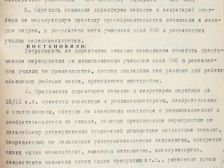 6. Предложить директорам заводов и секретарям партбюро до 25.09 с.г. провести совещание с рационализаторами, изобретателями и стахановцами, обсудив на совещании состояние с рационализацией и изобретательством на заводе, наметив практические ме-роприятия по направленной на дальнейшее усовершенствование технологии, внедрения скоростного освоения новых видов продукции и т.д., установив сроки, условия для производства экспериментальных работ, по освоению принятого предложения и внедрению его в производство.