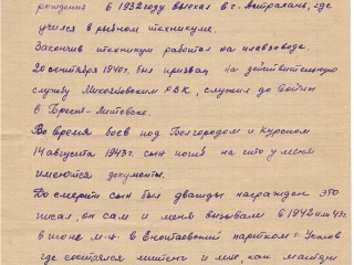 Подробности о гибели сына мне описала старушка, к которой Миша ходил она сообщила что во время боев за Лес [Шаровск] загорел Мишин танк горящей он выбежал и стрелял по немцам из автомата и пулью в грудь был сражен, после я подошла к нему он был мертв. Похоронили его в братскую могилу в 5 метрах от его гибили Пишут мне пионеры с Шаровки где похоронен мой сын, что вы счастливы Евдокия Ивановна тем что Ваш сын погиб в нашем селе за его могилой мы строго следим и ухаживали могила его находится в хорошем состоянии.