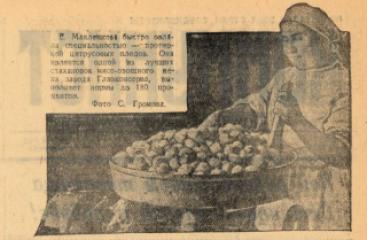 Или «В. Макленкова быстро овладела специальностью – протиркой цитрусовых плодов. Она является одной из лучших стахановок мясо-овощного цеха завода Главкосерва, выполняет нормы до 180 процентов».