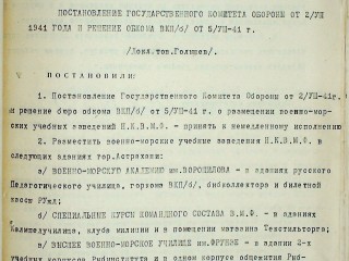 1. Постановление ГоКО СССР от 2 августа 1941 г. и решение обкома ВКП(б) от 5 августа 1941 г. о размещении военно-морских учеб¬ных заведений НКВМФ - принять к немедленному исполнению.
