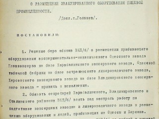 1. Решение бюро обкома ВКП(б) о размещении прибывающего оборудования экспериментально-механического Одесского завода Главконсерва на базе Харабалинского консервного завода, Одесской табачной фабрики на базе Астраханского ликероводочного завода, Херсонского консервного завода на базе Владимировского консервного завода - принять к исполнению.