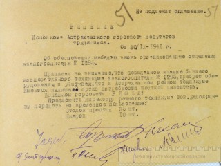 Принимая во внимание, что переданное здание бывшего кооперативного техникума эвакогоспиталю №1295, требует оборудования и учитывая, что в Астраханском речном техникуме имеется излишнее [пртив] потребности жесткий инвентарь, Исполком горсовета РЕШИЛ: