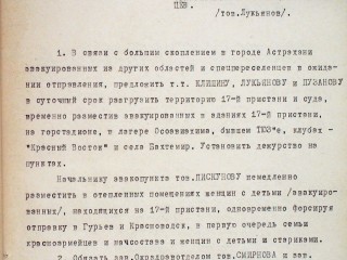 1. В связи с большим скоплением в гор. Астрахани эвакуированных из других областей и спецпереселенцев в ожидании отправления предложить тт. Клишину, Лукьянову и Пузанову в суточный срок разгрузить территорию 17-й пристани и суда, временно разместив эвакуированных в зданиях 17-й пристани, на горстадионе, в лагере Осоавиахима, бывшем ТЮЗе, клубах «Красный Восток» и с. Бахтемир. Установить дежурство на пунктах.