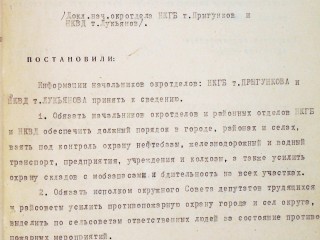 1. Обязать начальников окротделов и районных отделов НКГБ и НКВД обеспечить должный порядок в городе, районах и селах, взять под контроль охрану нефтебазы, железнодорожный и водный транспорт, предприятия, учреждения и колхозы, а также усилить охрану складов с мобзапасами и бдительность на всех участках.