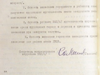3. Обязать руководителей предприятий и транспорта вместе со штабом ПВХО немедленно разработать и провести мероприятия по маскировке важнейших производственных объектов, обратив особое внимание управляющего Астраханским отделением Главнефтесбыта тов. Арапова на маскировку всей имеющейся складской ёмкости.