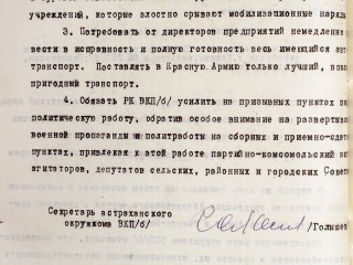 ПОСТАНОВЛЕНИЕ АСТРАХАНСКОГО ОКРУЖКОМА ВКП(б) ОБ ИТОГАХ ПРОВЕДЕНИЯ ПЕРВОГО ДНЯ МОБИЛИЗАЦИИ ПО АСТРАХАНСКОМУ ОКРУГУ