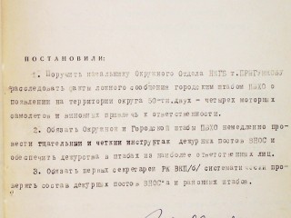 1. Поручить начальнику Окротдела НКГБ расследовать факты ложного сообщения городским штабом ПВХО о появлении на территории округа 50-ти двух-четырех моторных самолетов и виновных привлечь к ответственности.