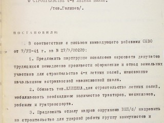 4. Обязать первых секретарей Наримановского, Харабалинского и Красноярского райкомов ВКП(б) оказать практическую помощь в организации и приспособлении летных полей на территории района.